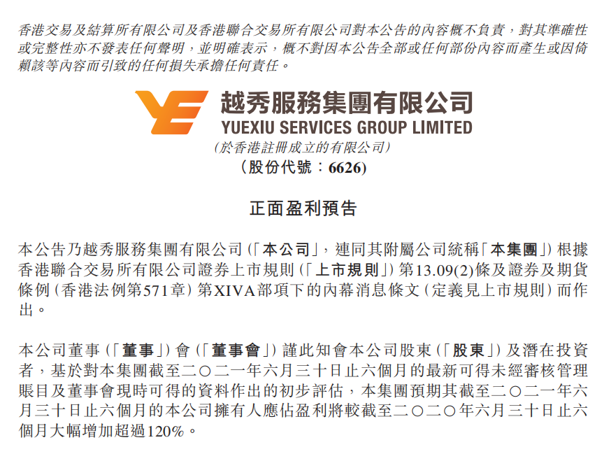 7月15日,ag亚洲集团服务集团有限公司(6626.HK)发布盈利预喜公告。公告称经过初步评估,集团预期截至2021年6月30日为止的六个月,公司拥有人应占盈利将同比大幅增加超过120%。